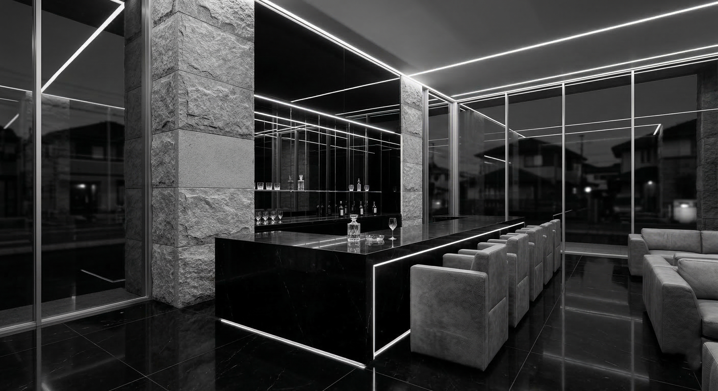 粗石と黒大理石が織りなす。一杯の琥珀が、重力から思考を解き放つ。